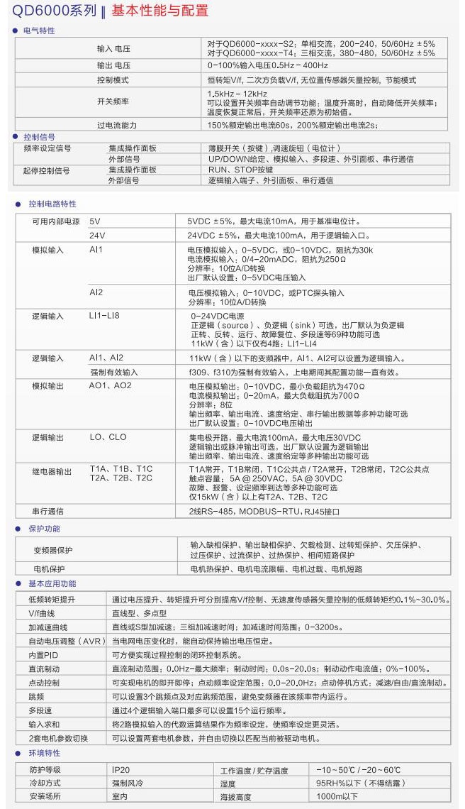 QD6000系列是2138cn太阳集团城科技开发的新一代高性能变频器,以符合广大用户的应用需求为设计理念,具有丰富的功能,卓越稳定的性能,简洁新颖的结构。QD6000系列变频器采用了先进的无速度传感器矢量控制技术、先进的电机参数辨识、在线估计技术及先进的磁链估计技术,无论是在调速范围还是在动态响应、控制精度及低频转矩上均得到了很大的提高。
